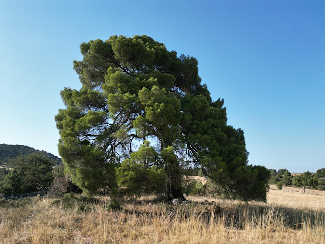 No es fácil la orientación por estos terrenos para un foráneo, pero, con las indicaciones de las gentes de Castejón de Monegros, me voy a contemplar dos árboles únicos. Como es pleno verano y son las cuatro de la tarde, el riesgo de perderse es alto y opto por llevar el coche. El trak que se ha subido a wikiloc así lo indica. Es una comarca a la que volveré porque merece la pena la contemplación del paisaje desde, por ejemplo, el Plano de la Cruz bajo el cual paso. Las indicaciones me sirvieron para hallar los dos árboles pero tuve mucha suerte.