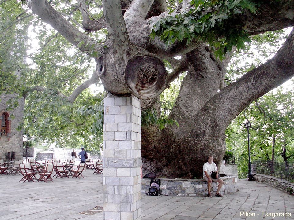 sobre el mar Egeo. En Tsagarada, en la plaza de Agia Paraskevi, crece este plátano oriental que mide 14 metros de perímetro y del que se dice que tiene mil años.